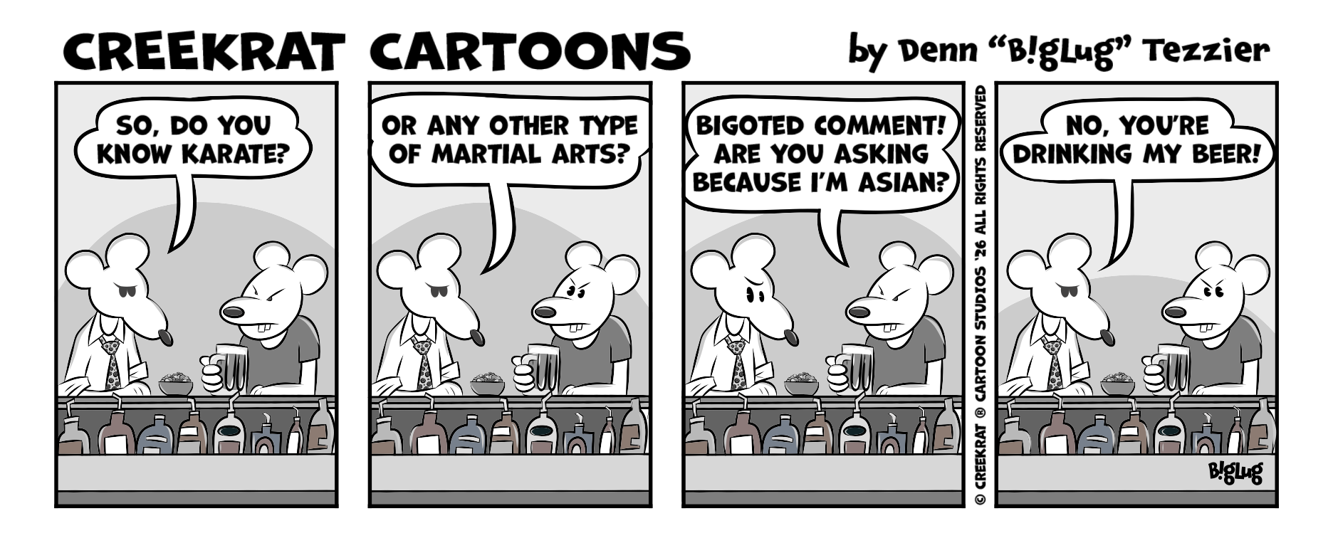 CREEK RAT MERCH DROP! ALWAYS ADDING MORE STUFF! CHECK IT OUT HERE! Back by Popular Demand! Our Creek Rat Company Vintage Mercury "Tower of Power" and "Power Beast" Tees & Mugs! Our Creek Rat Merch Drop Vintage Flagship T-Shirts & Ball Caps Available Online! Our Creek Rat Cartoon Studios Vintage Flagship T-Shirt in White! Our Creek Rat Cartoon Studios Vintage Flagship T-Shirt in Black! Our Creek Rat Cartoon Studios Vintage Flagship Ball Caps! Back in Stock! Our Creek Rat Camo Ball Caps! Hey Check Out Our NEW Way Cool University of California Topanga Canyon Creek Rat Co. 1969-2026 Vintage-Inspired Clothing Collection! Our Creek Rat Company Vintage-Inspired Clothing Collection from Daze Gone By! Fer EZ Ordering of Original Creekrat CARtoon Studios Art, all youse gotta do is contact Denn "BigLug" Tezzier at Creekrat CARtoon Studios - email biglug@creekrat.com - phone/text +1.206.683.8682 and tell us what type of CARtoon youse need and include yer best descriptions, ideas and suggestions and provide us with as many examples and/or photos as youse can, etc! FREE ESTIMATES!