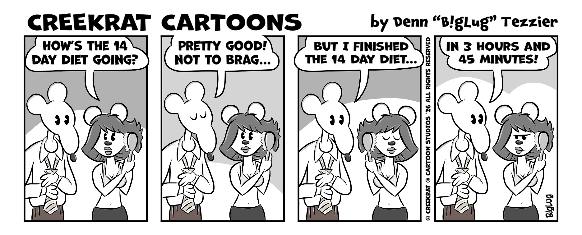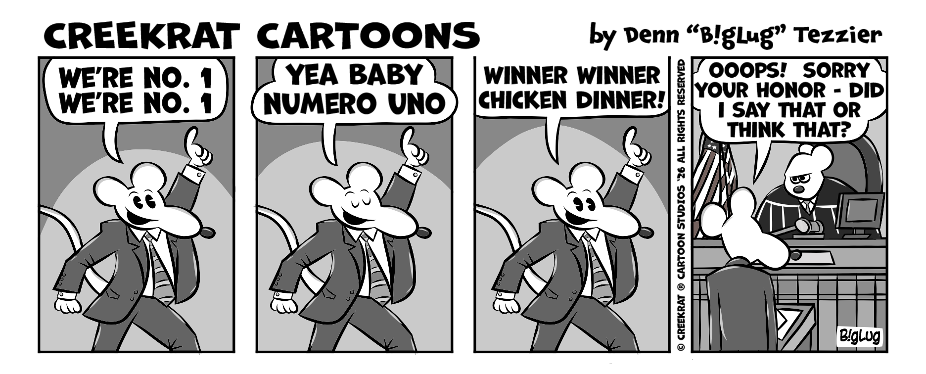 CREEK RAT MERCH DROP! ALWAYS ADDING MORE STUFF! CHECK IT OUT HERE! NEW RELEASE! Our Creek Rat Company Vintage Style 2026 Logo Tees & Mugs! Back by Popular Demand! Our Creek Rat Company Vintage Mercury "Tower of Power" and "Power Beast" Tees & Mugs! Back in Stock Due to Popular Demand, Our Creek Rat Vintage BEDAZZLED SWEETIE SILVER METALFLAKE SPARKLE GLITTER BOMB T-SHIRT IN BLACK! Our Creek Rat Merch Drop Vintage Flagship T-Shirts & Ball Caps! Our Creek Rat Vintage FLAGSHIP T-SHIRT IN WHITE! Our Creek Rat Vintage FLAGSHIP T-SHIRT IN BLACK! Our Creek Rat Vintage Flagship Ball Caps! Back in Stock! Our Creek Rat Camo Ball Caps! Hey Check Out Our Cool University of California Topanga Canyon Creek Rat Co. 1969-2026 Vintage-Inspired Clothing Collection! Our Creek Rat Company Vintage-Inspired Clothing Collection from Daze Gone By! Fer EZ Ordering of Original Creekrat CARtoon Studios Art, all youse gotta do is contact Denn "BigLug" Tezzier at Creekrat CARtoon Studios - email biglug@creekrat.com - phone/text +1.206.683.8682 and tell us what type of CARtoon youse need and include yer best descriptions, ideas and suggestions and provide us with as many examples and/or photos as youse can, etc!