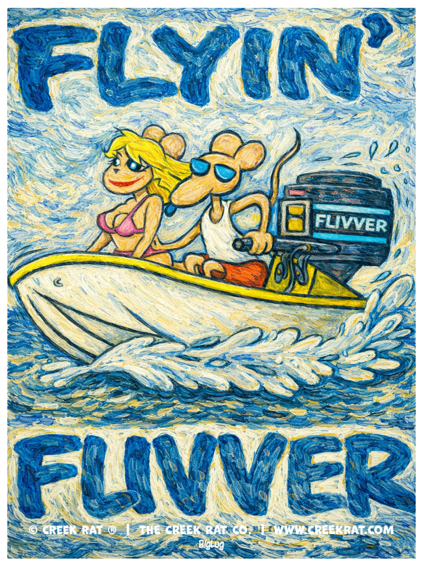 January 2026 - Flyin' Flivver Boat Art using traditional cartoon paper and pencil style, then through electronic formats on an iPad Pro and then through AI. We offer awesome discounts for Flivver Boat Cartoon Art Requests! Get your Fliver Boat Cartooned by the Creek Rat! A Killer Addition to the Wall on your Man Cave! You can also take the electronic files and apply them to your own Tee-Shirts, etc.