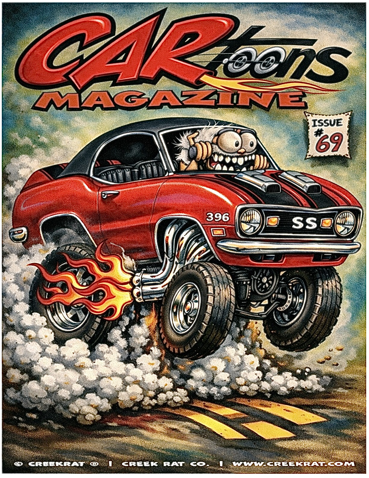 Get Yer Ride on the Cover of Creekrat Hot Rod CARtoons Magazine! CREEKRAT'S HOT ROD CARtoons Magazine COVERS! We Love Hot Rod Cartoons Magazine and Very Happy to see it back in publication! Now you can get your Sweet Ride on the cover of the Cover! They Look Awesome Framed too! Same deal as our other Hot Rod CARtoons (Send us photos and we Hot Rod CARtoon your Ride) but you get to add text youse want fer that special unique [Static and/or Animated] personal touch! Looks like the Real Deal because it is all original hand drawn art!