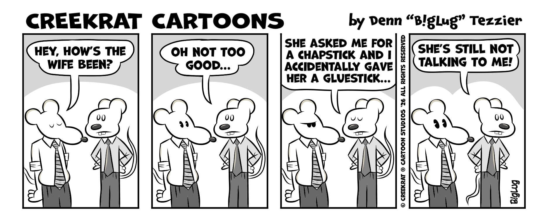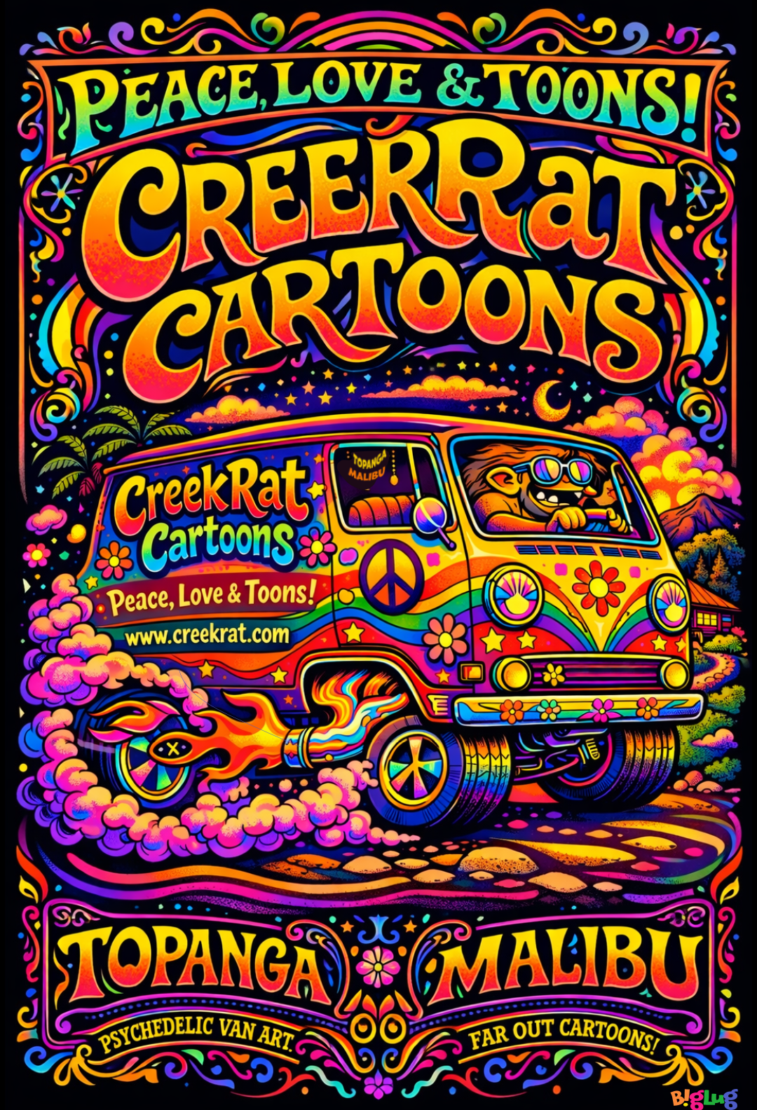 CREEK RAT MERCH DROP! ALWAYS ADDING MORE STUFF! CHECK IT OUT HERE! Back by Popular Demand! Our Creek Rat Company Vintage Mercury "Tower of Power" and "Power Beast" Tees & Mugs! Our Creek Rat Merch Drop Vintage Flagship T-Shirts & Ball Caps Available Online! Our Creek Rat Cartoon Studios Vintage Flagship T-Shirt in White! Our Creek Rat Cartoon Studios Vintage Flagship T-Shirt in Black! Our Creek Rat Cartoon Studios Vintage Flagship Ball Caps! Back in Stock! Our Creek Rat Camo Ball Caps! Hey Check Out Our Cool University of California Topanga Canyon Creek Rat Co. 1969-2026 Vintage-Inspired Clothing Collection! Our Creek Rat Company Vintage-Inspired Clothing Collection from Daze Gone By! Fer EZ Ordering of Original Creekrat CARtoon Studios Art, all youse gotta do is contact Denn "BigLug" Tezzier at Creekrat CARtoon Studios - email biglug@creekrat.com - phone/text +1.206.683.8682 and tell us what type of CARtoon youse need and include yer best descriptions, ideas and suggestions and provide us with as many examples and/or photos as youse can, etc! FREE ESTIMATES!