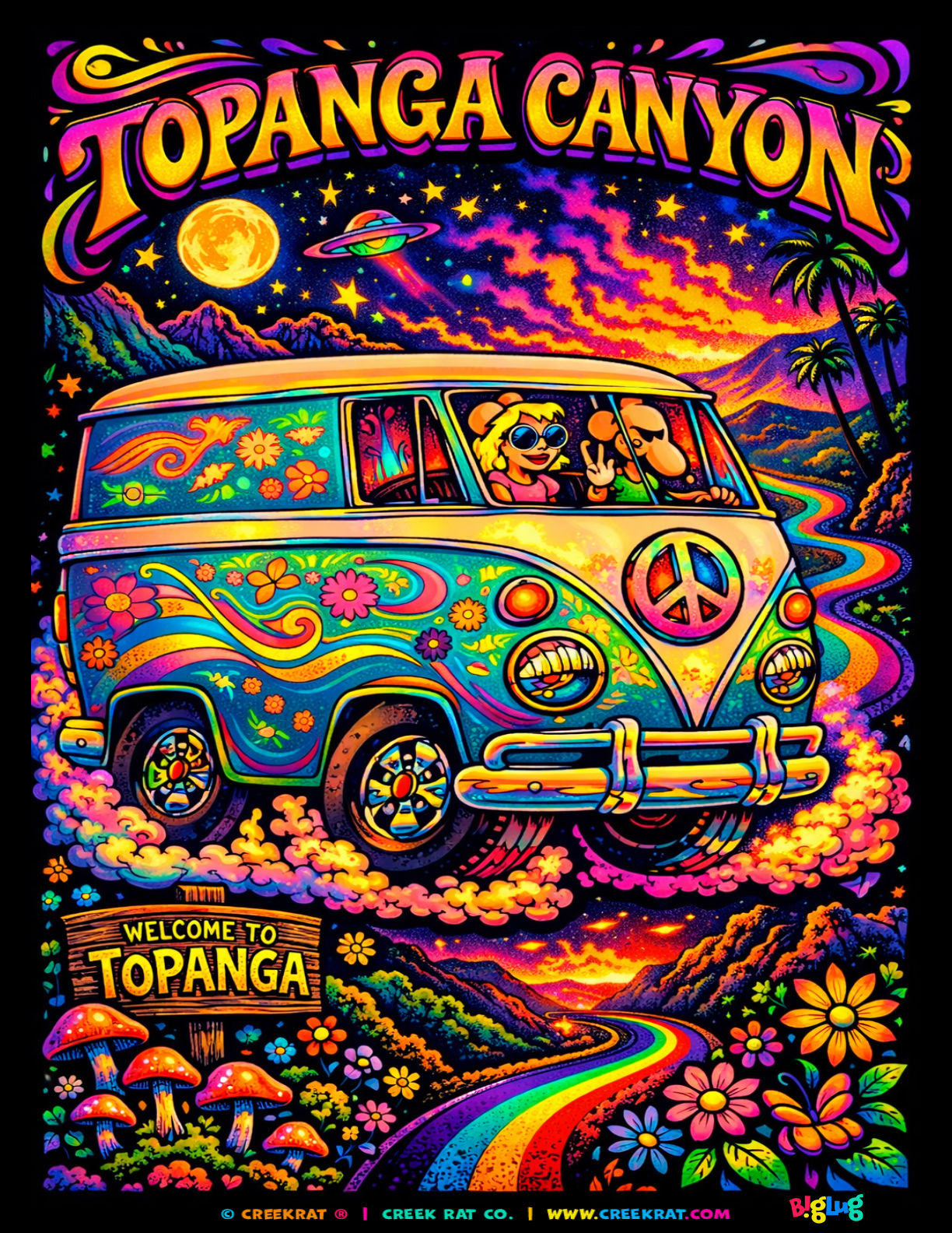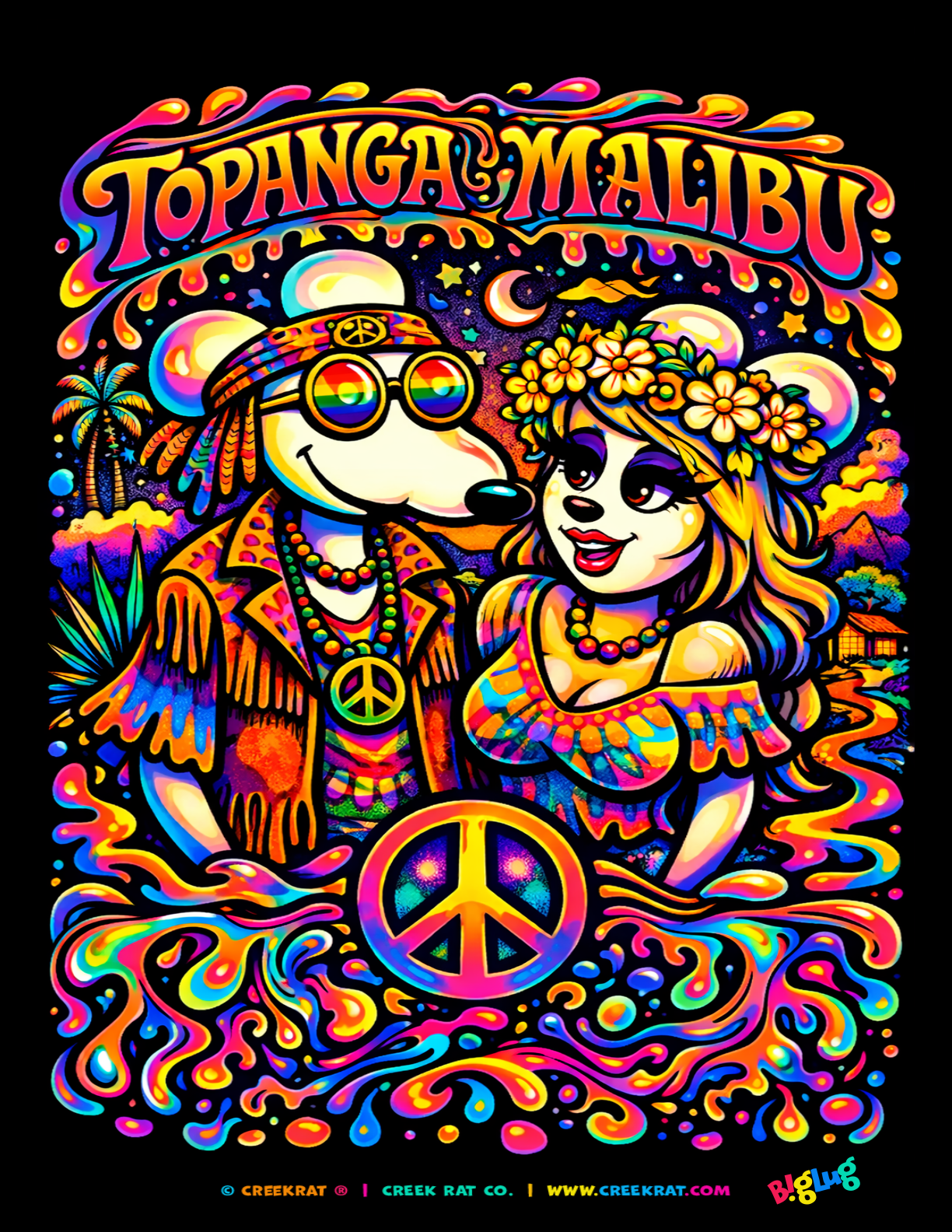 What is Creek Rat? The Creek Rat Brand was started by Denn Tezzier in the 1960’s. Historically, a Creek Rat is what the Locals endearingly called us Kids who grew up and hung out at the Creek in Topanga Canyon California. Topanga Creek originates in the Santa Monica Mountains in Los Angeles County California and drains directly down to the beach on the Pacific Ocean south of Malibu. Topanga Creek is one of the few remaining waterways in the area without dams and is a spawning ground for Southern California Steelhead Trout. Denn Tezzier, being a Creek Rat Kid in Topanga, was also known as a local artist doing art in different expressions. The Canyon newspaper of the day, The Topanga Messenger, approached Denn to create a comic strip for publication in the newspaper, and Denn came up with the idea for the Creek Rat Cartoons Comic Strip. Creek Rat is still published to this day. Over the years, the Creek Rat Brand has advanced into many different artistic styles, contemporary mediums, modern technologies as well as product manufacturing, merchandising, marketing, marine, automotive, spirits, clothing brands and multimedia platforms, and all still remaining and continuing in the Original Classic Vibe of Topanga Canyon and Malibu Beach.
