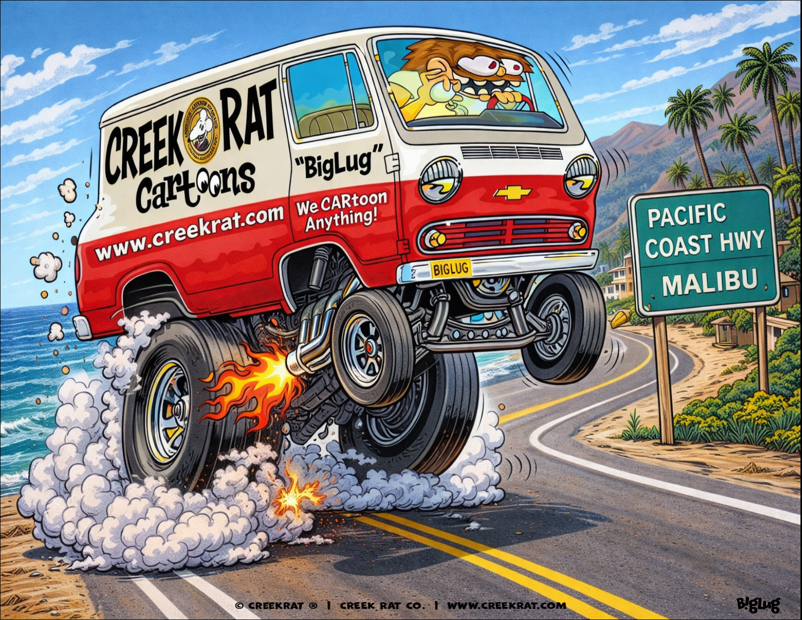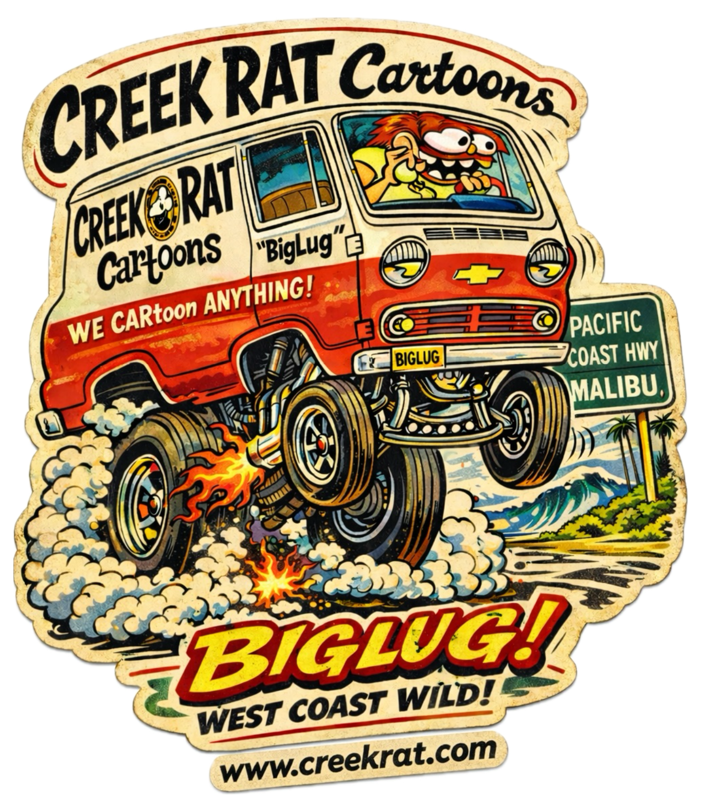 Our 2026 Creek Rat CARtoons Logo Art for Decals and Tee-Shirts! Tooling on PCH to the Topanga Canyon and Malibu Beaches!