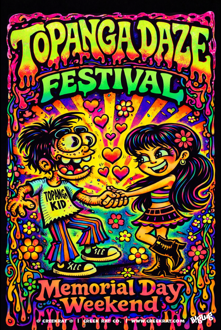 What is Creek Rat? The Creek Rat Brand was started by Denn Tezzier in the 1960’s. Historically, a Creek Rat is what the Locals endearingly called us Kids who grew up and hung out at the Creek in Topanga Canyon California. Topanga Creek originates in the Santa Monica Mountains in Los Angeles County California and drains directly down to the beach on the Pacific Ocean south of Malibu. Topanga Creek is one of the few remaining waterways in the area without dams and is a spawning ground for Southern California Steelhead Trout. Denn Tezzier, being a Creek Rat Kid in Topanga, was also known as a local artist doing art in different expressions. The Canyon newspaper of the day, The Topanga Messenger, approached Denn to create a comic strip for publication in the newspaper, and Denn came up with the idea for the Creek Rat Cartoons Comic Strip. Creek Rat is still published to this day.