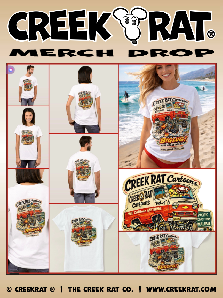 CREEK RAT MERCH DROP! ALWAYS ADDING MORE STUFF! CHECK IT OUT HERE! NEW RELEASE! Our Creek Rat Company Vintage Style 2026 Logo Tees & Mugs! Back by Popular Demand! Our Creek Rat Company Vintage Mercury "Tower of Power" and "Power Beast" Tees & Mugs! Our Creek Rat Merch Drop Vintage Flagship T-Shirts & Ball Caps Available Online! Our Creek Rat Cartoon Studios Vintage Flagship T-Shirt in White! Our Creek Rat Cartoon Studios Vintage Flagship T-Shirt in Black! Our Creek Rat Cartoon Studios Vintage Flagship Ball Caps! Back in Stock! Our Creek Rat Camo Ball Caps! Hey Check Out Our Cool University of California Topanga Canyon Creek Rat Co. 1969-2026 Vintage-Inspired Clothing Collection! Our Creek Rat Company Vintage-Inspired Clothing Collection from Daze Gone By! Fer EZ Ordering of Original Creekrat CARtoon Studios Art, all youse gotta do is contact Denn "BigLug" Tezzier at Creekrat CARtoon Studios - email biglug@creekrat.com - phone/text +1.206.683.8682 and tell us what type of CARtoon youse need and include yer best descriptions, ideas and suggestions and provide us with as many examples and/or photos as youse can, etc!